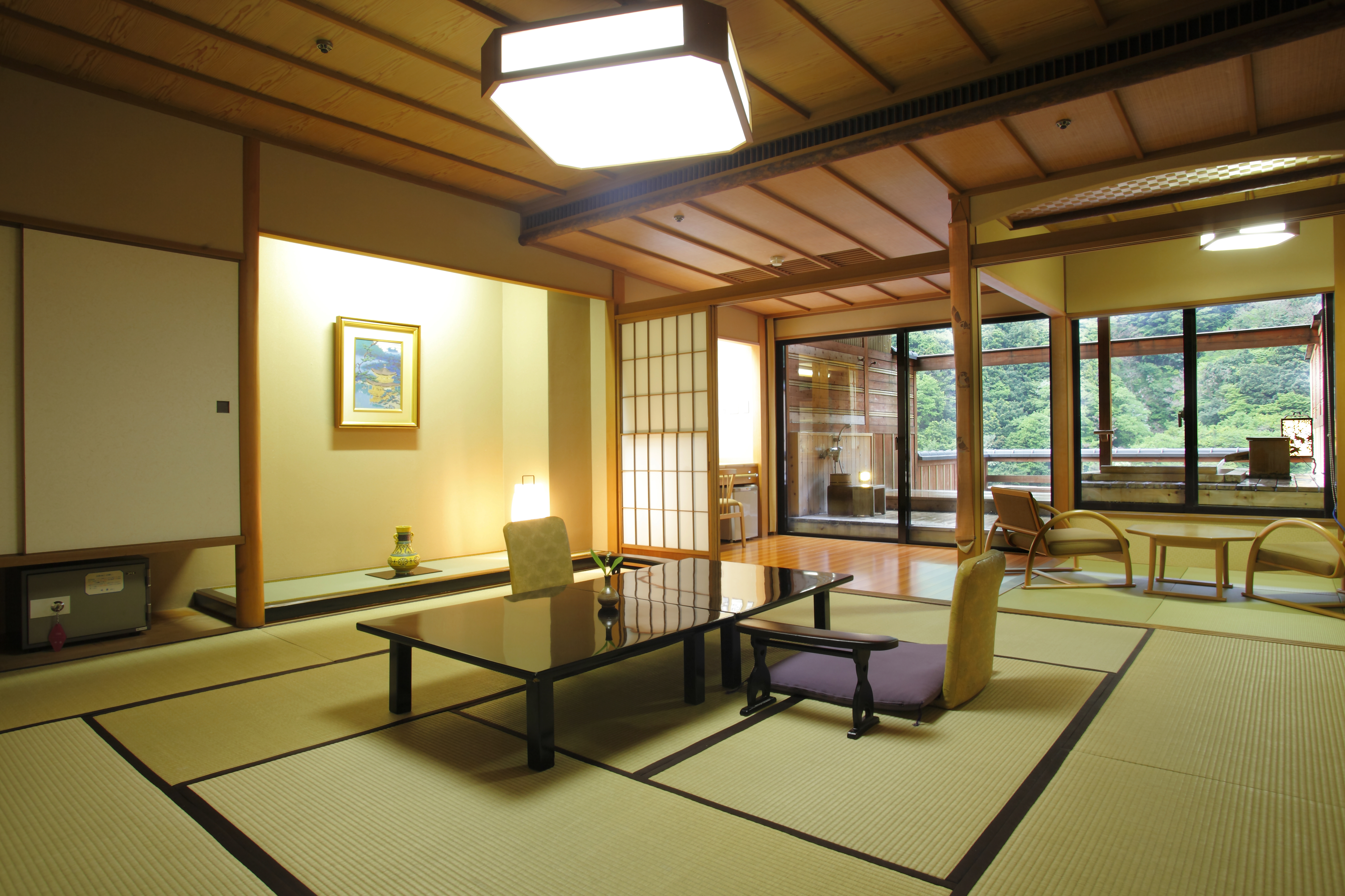 延楽の魅力のひとつでもある露天風呂付客室。さわやかな檜の香りと峡谷美を心ゆくまでご堪能下さい。