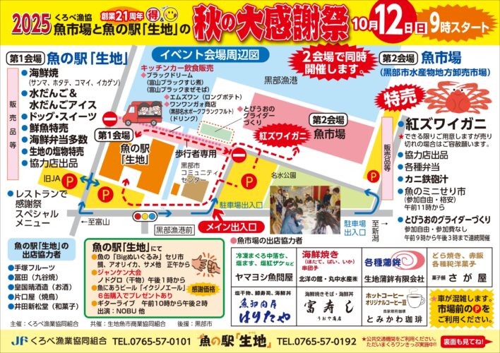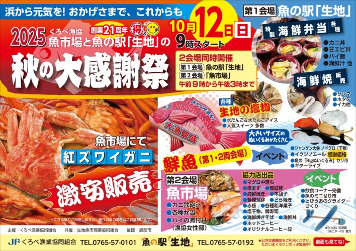 【10/12】秋の大感謝祭【くろべ漁協】 2025年10月12日 開催日時 2025年10月12日 開催場所 魚の駅「生地」、魚市場 0765-57-0192 お問い合わせ 魚の駅「生地」 日時:10月12日(日)9時から 場所:魚の駅「生地」、魚市場 https://www.jf-kurobe.jp/sakananoeki-ikuji/index.php