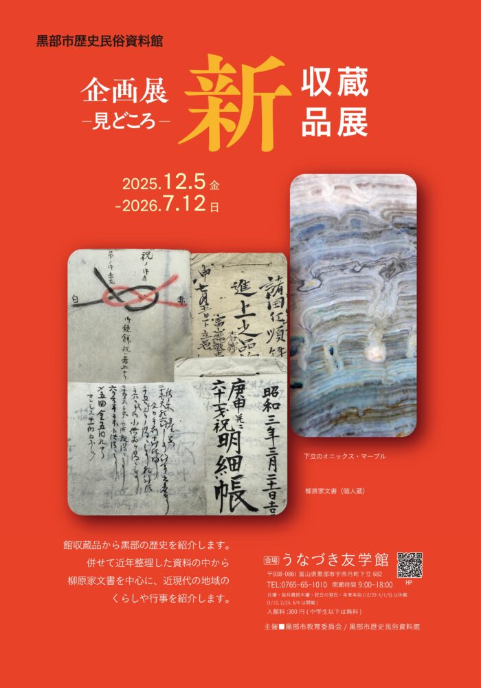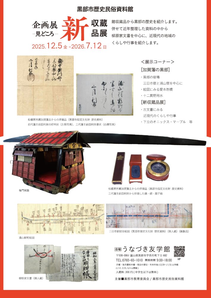 当館所蔵の資料から黒部の歴史を紹介します。併せて新収蔵の地域資料から近現代の暮らしや行事を中心に紹介します。(期間中一部展示替えあり)