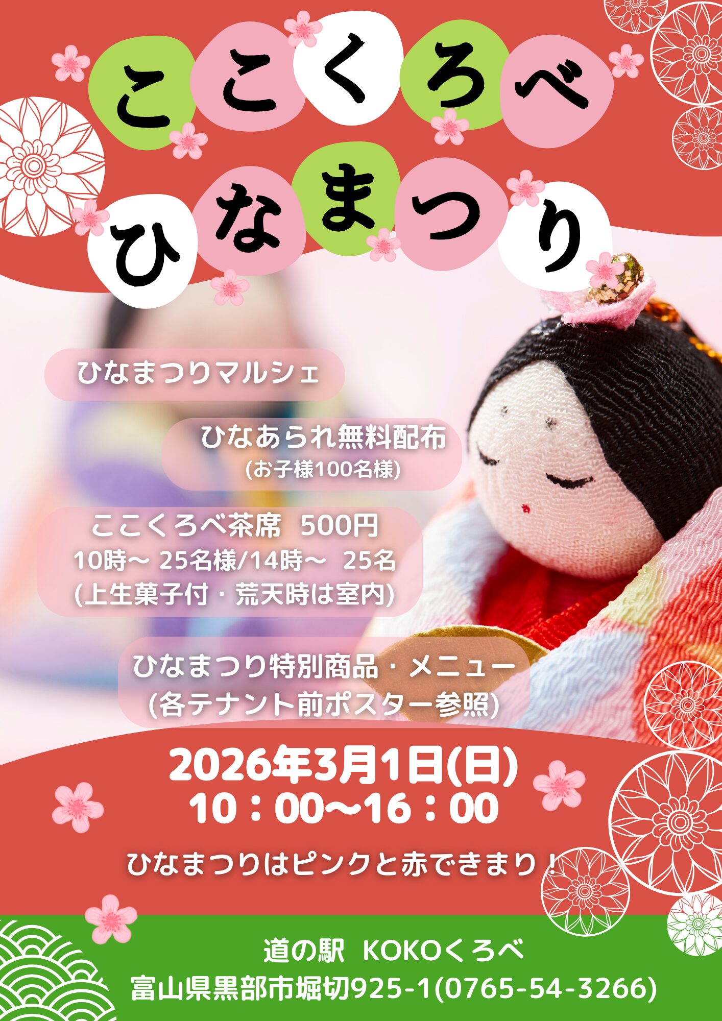 少しずつ春が近づいている今日この頃ですが、3月1日(日)ここくろべひなまつりを開催いたします✨