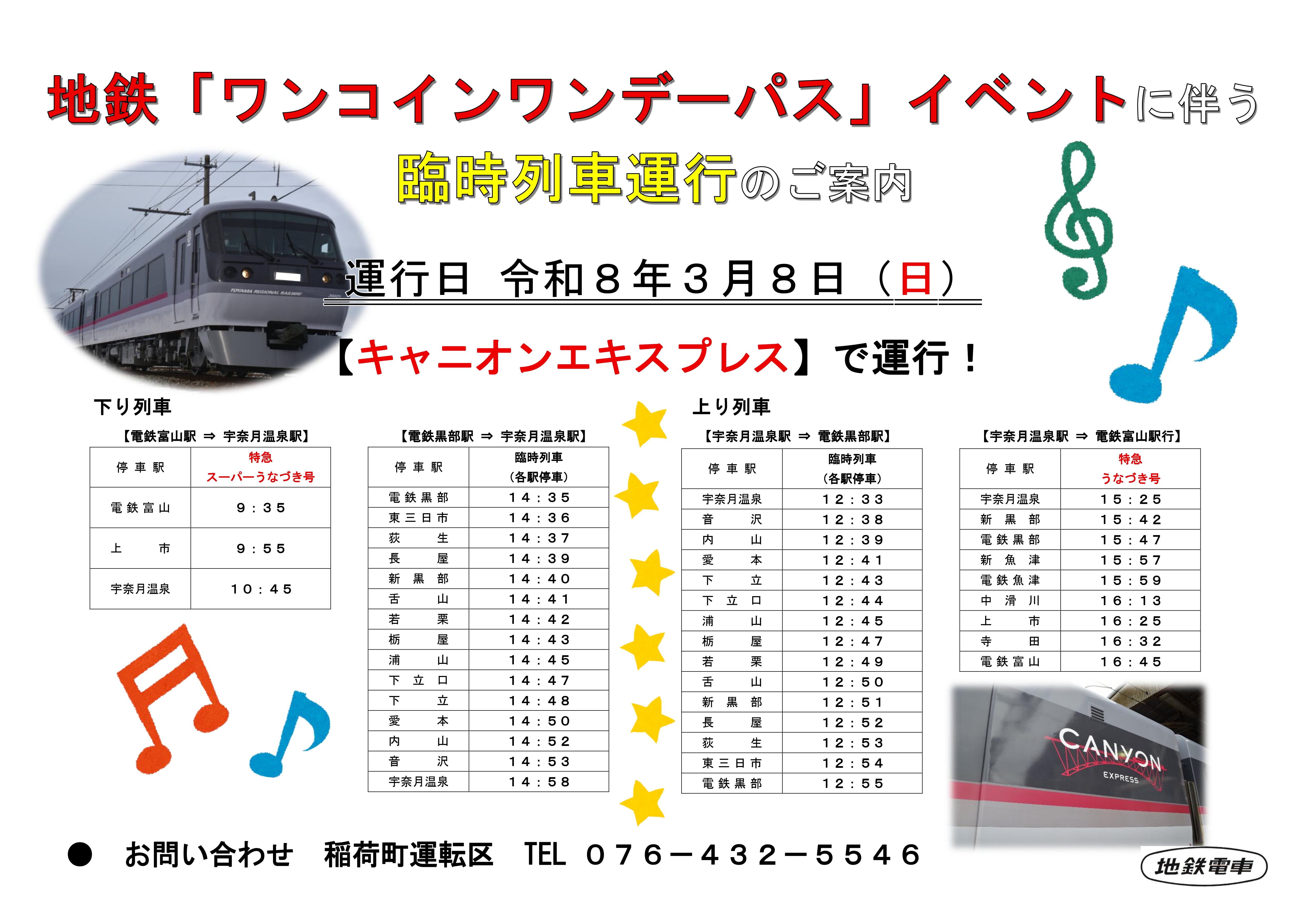 - 富山地方鉄道株式会社 鉄軌道部 営業課 TEL:076-432-5540 (平日:8:30~107:30)