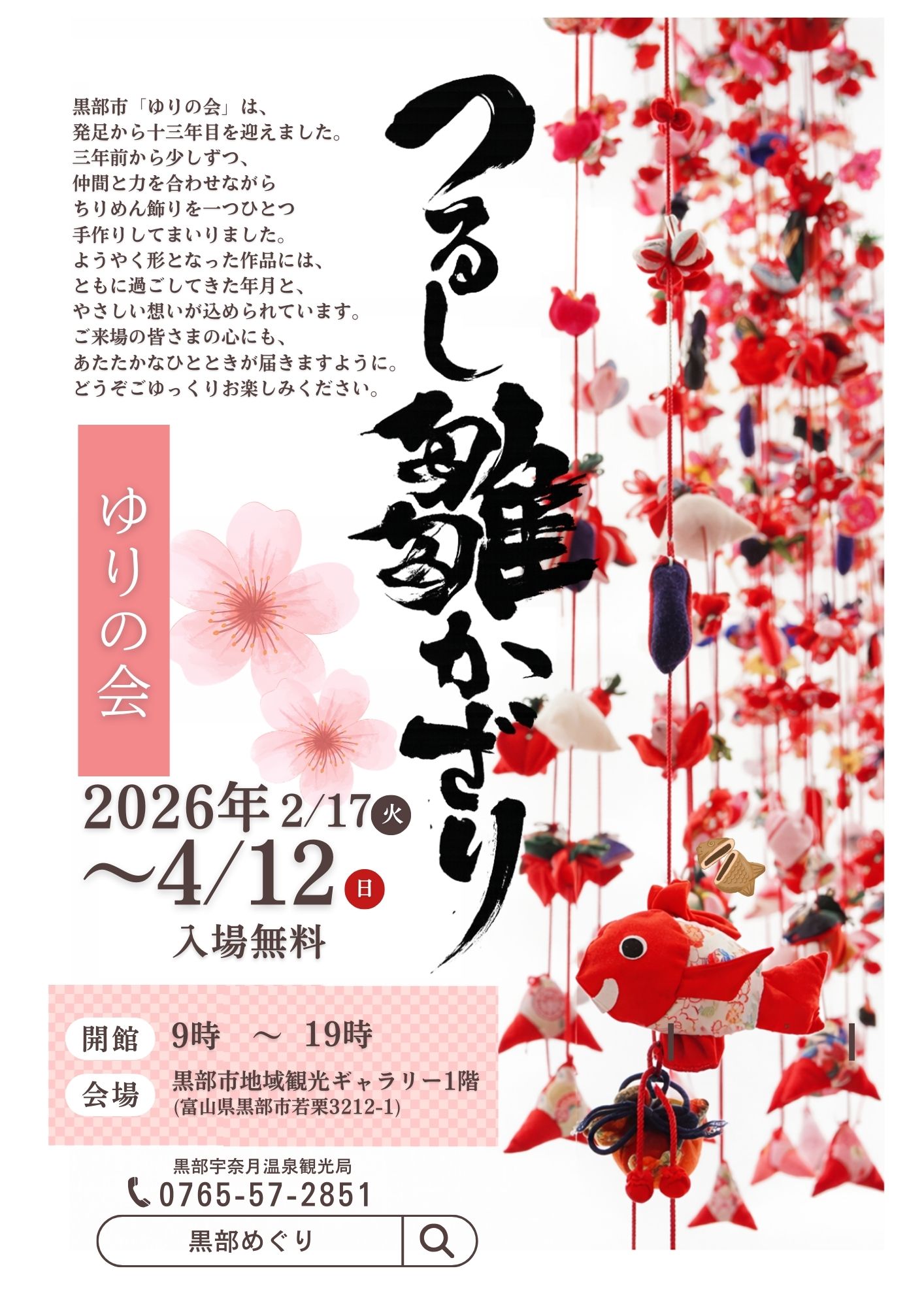 2026.02.16 つるし雛かざり展 黒部市「ゆりの会」は、発足から十三年目を迎えました。 三年前より、仲間と力を合わせながら、ちりめん飾りを一つひとつ手作りしてまいりました。 ようやく形となった作品には、共に歩んできた年月と、やさしい想いが込められています。 ご来場の皆さまの心にも、あたたかなひとときが届きますように。 どうぞごゆっくりお楽しみください。 開催期間:2026年2月17日(火)~4月12日(日) 時 間:9:00~19:00 会 場:黒部市地域観光ギャラリー