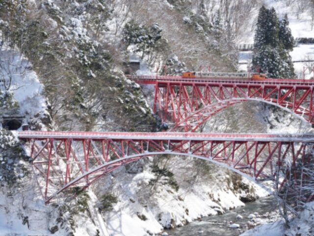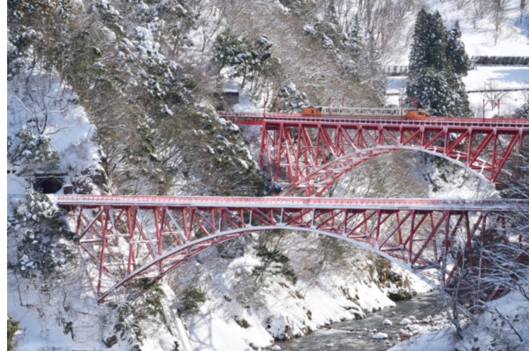 白銀の景色の中、新山彦橋をトロッコ電車で渡る!
